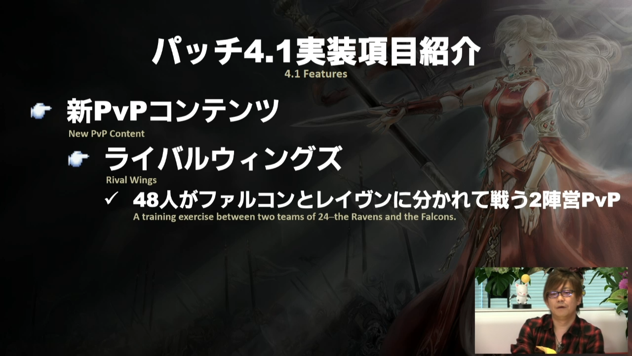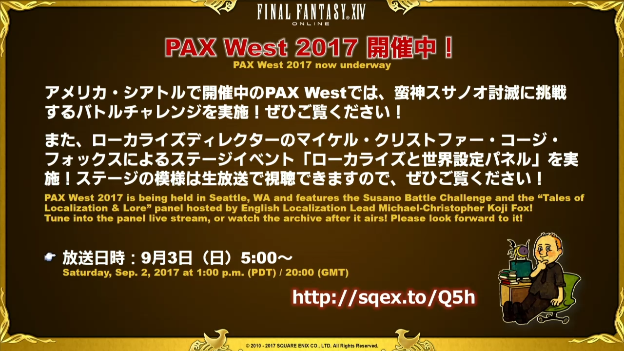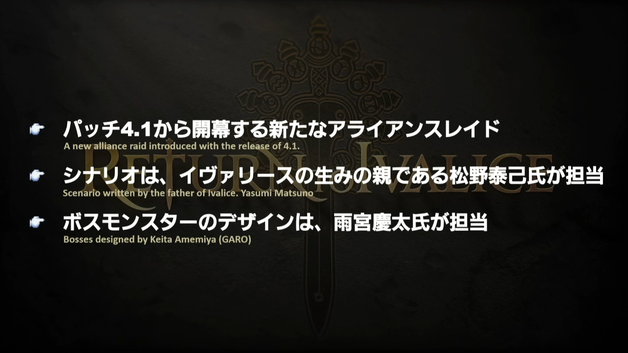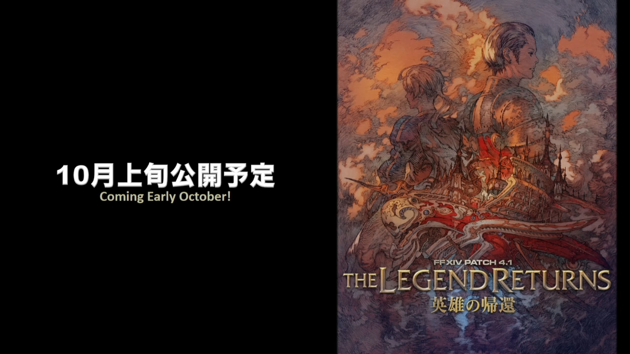 La Lettre Live a bien entendu débuté par une présentation du Producteur, Naoki Yoshida et du Producteur Communautaire Toshio « Foxclon » Murouchi qui nous dit que cette Lettre Live se déroulera en deux parties avec un invité qui n’est autre que Yasumi Matsuno, directeur de Final Fantasy XII et créateur de Ivalice Alliance. Après quoi, les hostilités ont débuté. Dans un premier temps, le titre Anglais de la prochaine mise à jour a été dévoilé, « The Legend Returns » et le patch sera déployé sur les serveurs début Octobre et contiendra bien entendu la continuité de la mise à jour 4.0 en terme de quête d’histoire, le tout se déroulera peu de temps après la libération d’Ala Mhigo.