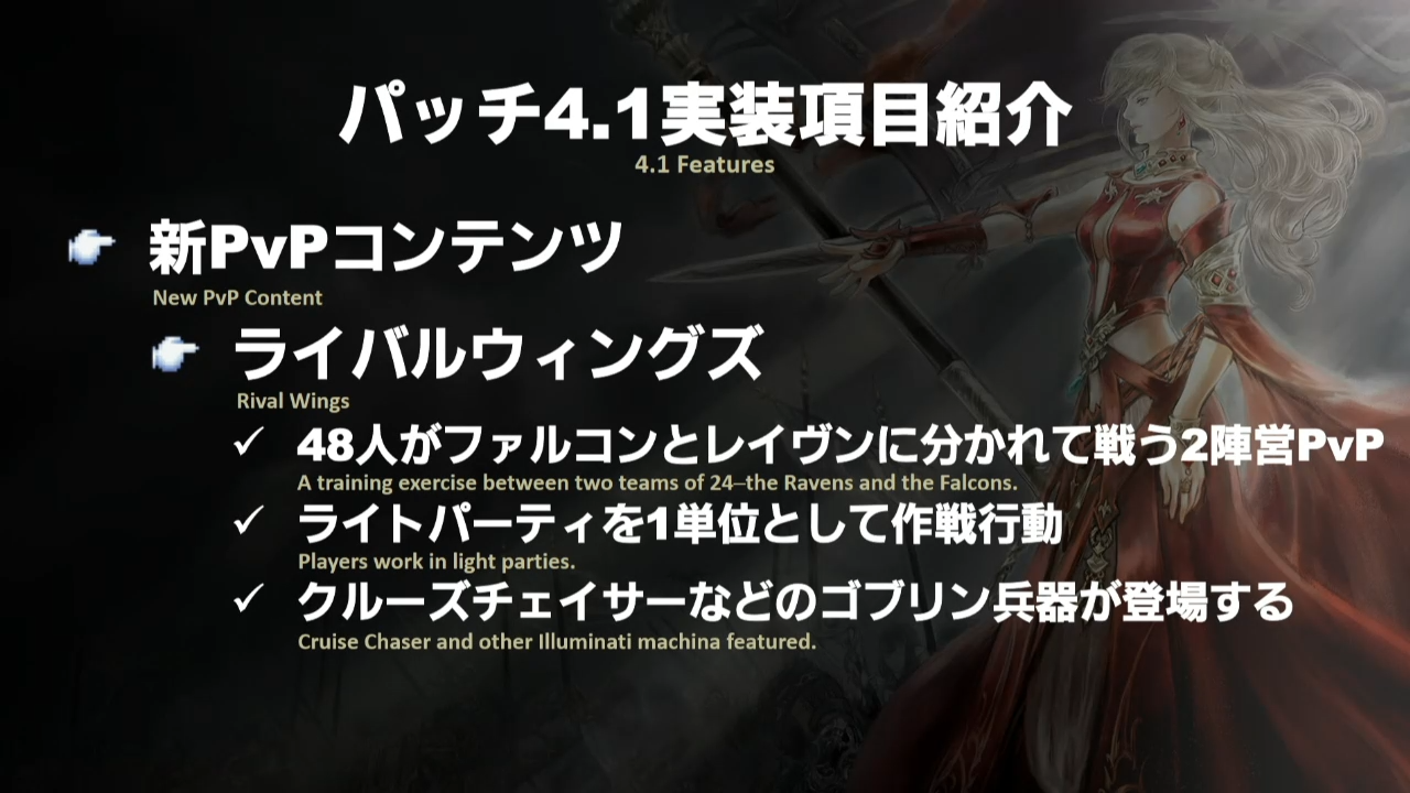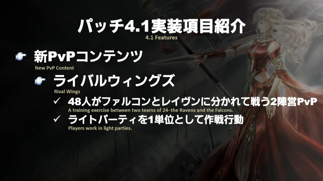 Un nouveau mode de jeu en PvP fait aussi son apparition et porte le nom de « Rival Wings« , deux factions, Faucons et Corbeaux se battent dans un mode de jeu type « Entrainement » en deux factions de 48 joueurs chacun répartis en unités de 4 joueurs et a pour cadre l’Arrière-Pays Dravanien. Sachez également que dans ce mode de jeu, le Chasseur-Croiseur et un Oppresseur seront contrôlables par les joueurs et disposeront d’attaques normales et d’une attaque ultime.