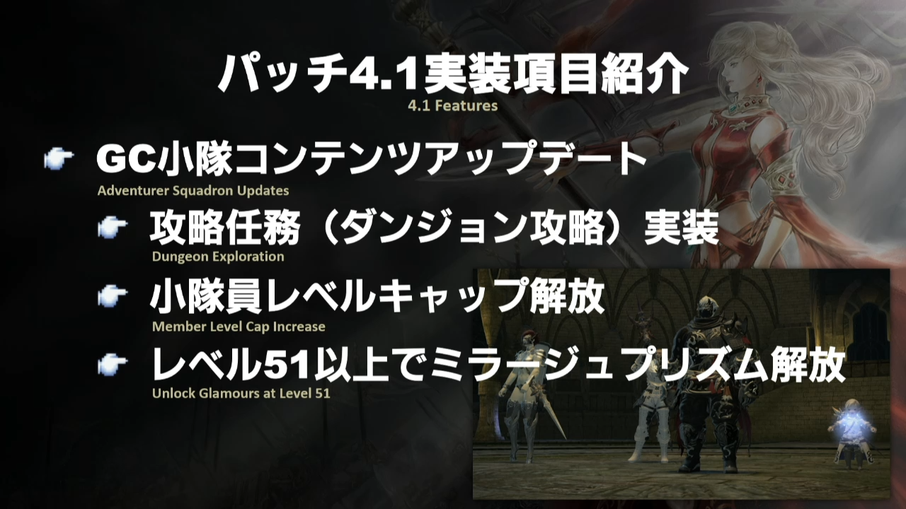 Les Escouades de Grandes Compagnies, vous savez, celles que vous laissez prendre la poussière depuis qu’ils sont niveau 50 ? Ils bénéficieront eux aussi de modification, parmi celles-ci, la possibilité de faire certains donjons où il est affirmé que si nous faisons les armes Anima, cela sera fort utile, la limite de niveau sera également augmentée et le glamour sera également possible sur les membres de l’équipe. Tout ceci fait l’objet d’une première série de mises à jours concernant ce système.
