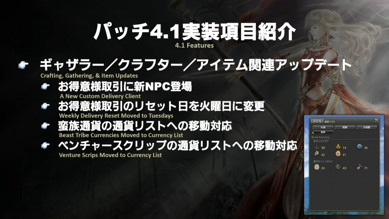 Parlons maintenant du système de craft, récolte et objets, un nouveau PNJ sera rendu disponible et concernera Zhloe dont le système de contribution se verra reset tous les Mardis au lieu de Jeudi et s’applique à toute forme de système de crafts et récolte, les assignats sont principalement visés par cette mesure. Certains objets prenant une place ridiculement inutile fera son entrée dans la section monnaies du jeu au même titre que les mémoquartz, il s’agit des monnaies obtenues lors des quêtes tribales mais aussi les jetons de tâches des servants.