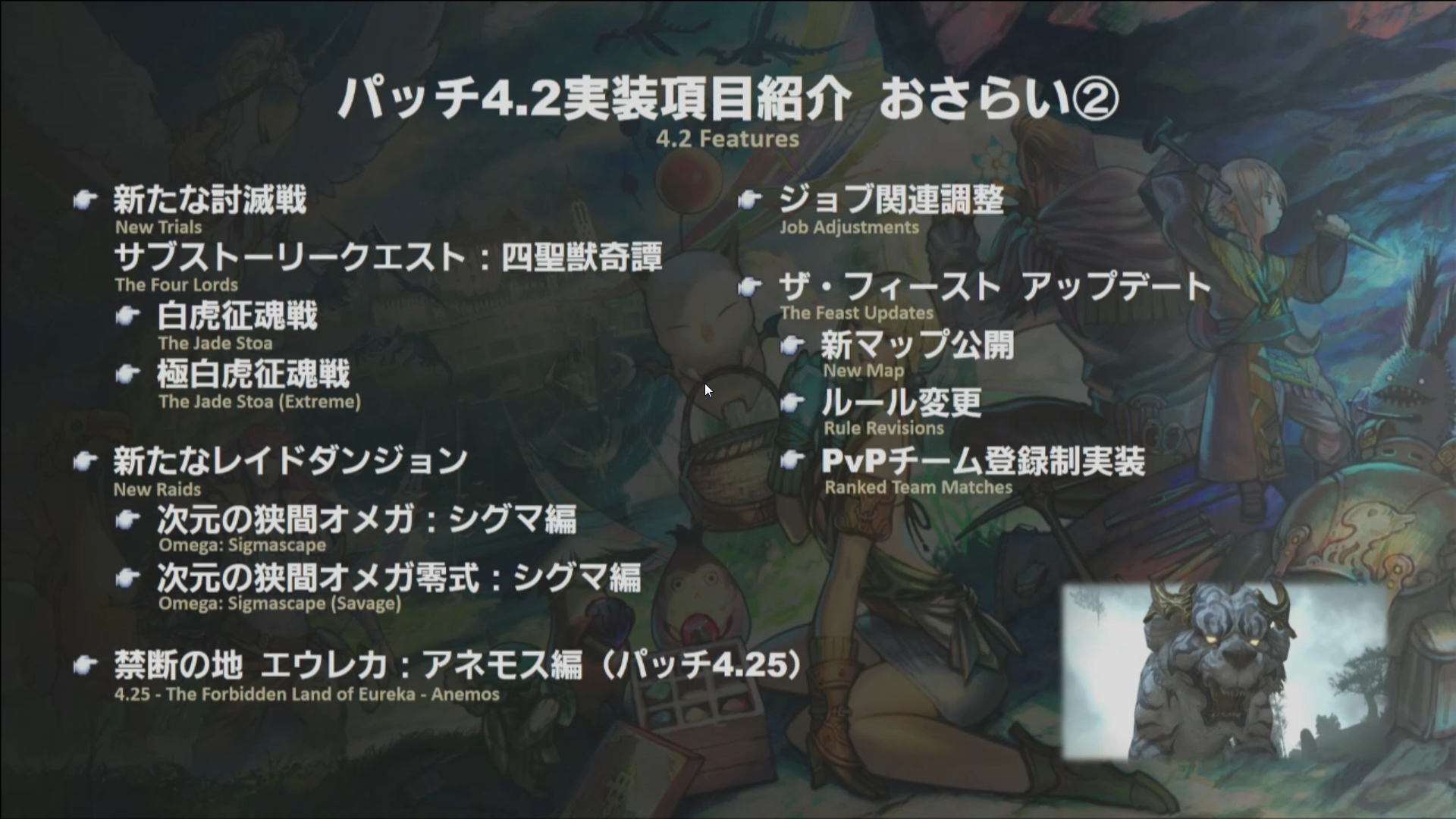 Naoki Yoshida nous montre quelques images du combat contre Byakko qui promet d’être épique. En rapport à une question sur le niveau de difficulté de l’extrême, le Producteur a indiqué qu’il serait supérieur à Susano et Lakhsmi, sans pour autant s’avancer sur un comparatif avec Shinryu en raison des nombreuses mécaniques qu’offre ce dernier. Deux montures, sur les trois vues pendant le trailer, sont présentées, le traditionnel loup, qui sera blanc et rayé de noir, que vous pourrez acquérir sur Byakko ainsi qu’une Griffe Magitek offrant une prise comique du personnage du Producteur.