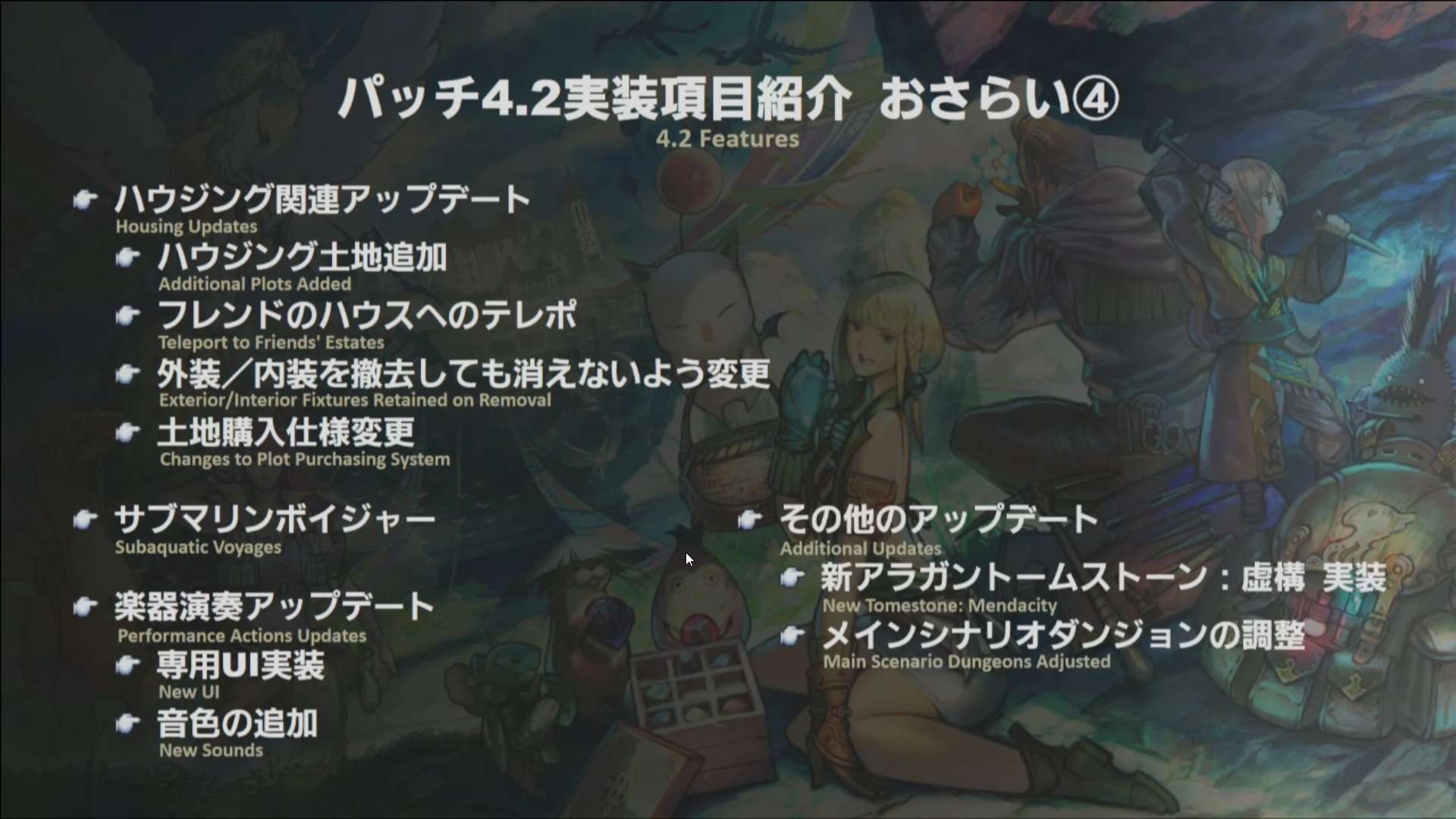 Outre la diffusion du trailer qui révèle quelques informations intéressantes, le patch 4.2 arrivera à la date du 30 Janvier 2018 après une maintenance de 24 heures, notez également que le système du housing ne devrait ouvrir qu’une heure après la mise en ligne des serveurs, tandis que les nouveaux terrains ne seront disponibles qu’une semaine plus tard. Ceux qui ont eu des difficultés à se connecter pour l’épisode Shirogane savent que c’est pour éviter la congestion, les files d’attentes, les crashs et les crises de nerfs.