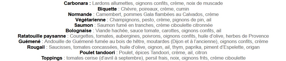 Le menu sera composé de 11 (onze) recettes salées et 12 (douze) ingrédients pour les recettes sucrées. Ce seront des Crêpes et Galettes petit format (mangeable à la main)