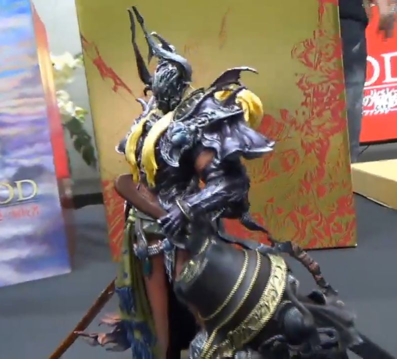 Lorsque l’on retire la protection en plastique, la boîte est dorée, et les dessins du logo Stormblood y figurent en rouge. La boîte s’ouvre simplement. Dès que Yoshi-P l’ouvre, nous pouvons remarquer que la figurine est protégée dans du plastique sur-mesure de façon à bien être calée dans la boîte. Pas de mauvaise surprise à l’ouverture, en somme ! Naoki Yoshida prend d’extrêmes précautions en ouvrant la protection. Nous pouvons alors remarquer que la figurine est très détaillée et peinte avec soin. C’est un bel objet de collection. Il s’agit de Zenos Yae Galvus, qui sera sans doute le grand méchant de cette extension, revêtu de son armure et armé de son canon et de sa longue épée. Elle semble être faite en plastique dur. Elle mesure 18 centimètres de haut.