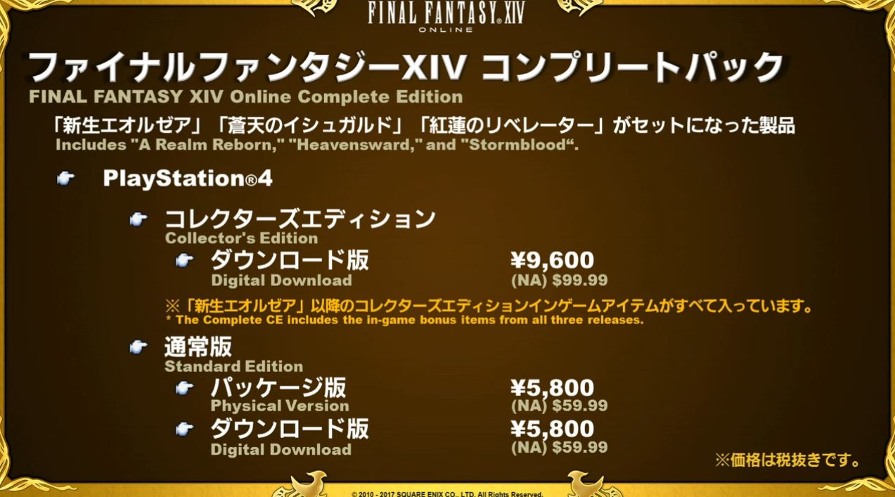 Sortira également une version « complète » du jeu avec A Realm Reborn, Heavensward et Stormblood. La version collector sera au prix de 99,99$ et comprendra tous les bonus in-game des précédentes extensions, à savoir : le casque de la lumière, la mascotte Bébéhémoth, la barde Béhémoth pour Chocobo, la monture Coeurl, la monture volante Griffon, le casque de Baron (inspiré du chevalier noir Cécil de Final Fantasy IV), la mascotte Kaïn miniature et un philtre d’illusion. Elle ne sera disponible qu’en version digitale.