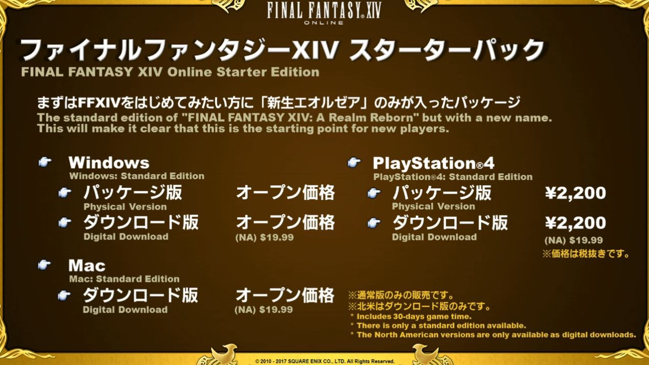 La version Starter, comme évoquée plus tôt, sera la version standard de Final Fantasy XIV : A Realm Reborn, mais avec un nouveau nom. Cela sera plus clair en ce qui concerne le début du jeu pour les nouveaux joueurs. La version digitale sera à 19,99 $.