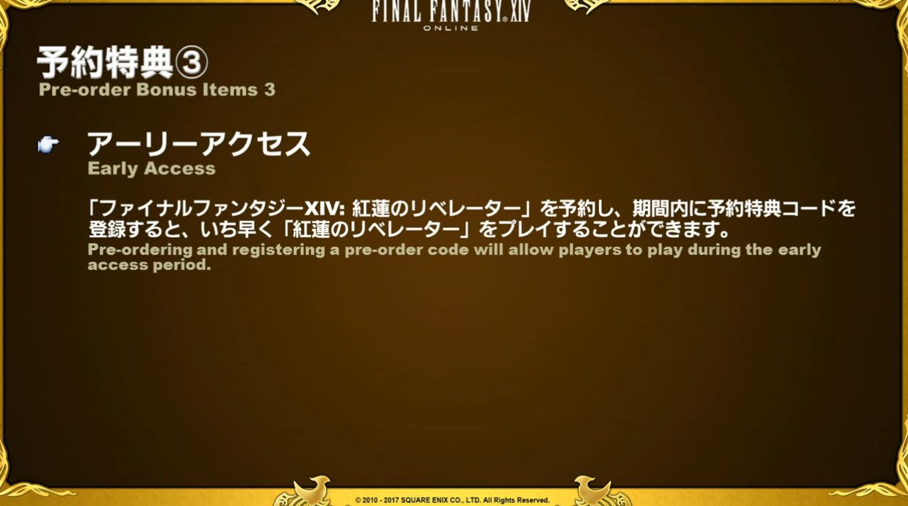 - Un accès anticipé qui pourra être accessible en entrant un code qui vous sera envoyé après votre précommande. L’accès anticipé commencera le vendredi 16 juin 2017 à 09h00 en Europe (heure GMT). C’est un objectif de Square Enix, donc rien n’est sûr, car une maintenance aura lieu avant cette date, et, en fonction du temps qu’elle prendra, l’heure pourra être repoussée.