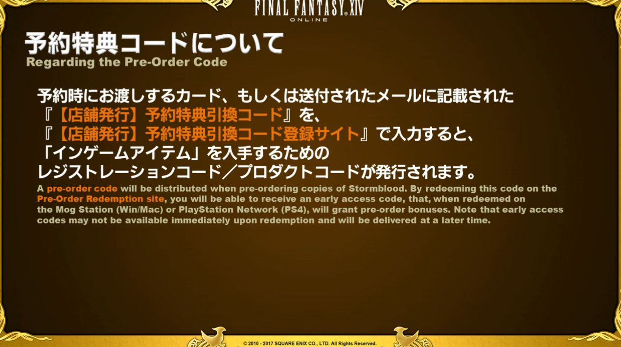 Le code de pré-commande sera distribué lorsque vous pré-commanderez votre version de Stormblood. Lorsque vous rentrerez ce code sur le site de pré-commande, vous recevrez un code pour l’accès anticipé, qui, entré sur la Mog Station (pour les versions PC et Mac) et sur le PlayStation Network (pour la PlayStation 4), vous donneront accès aux bonus de pré-commande.