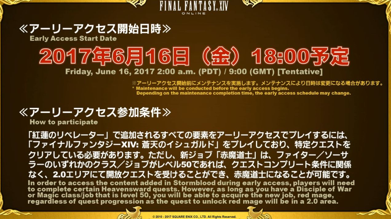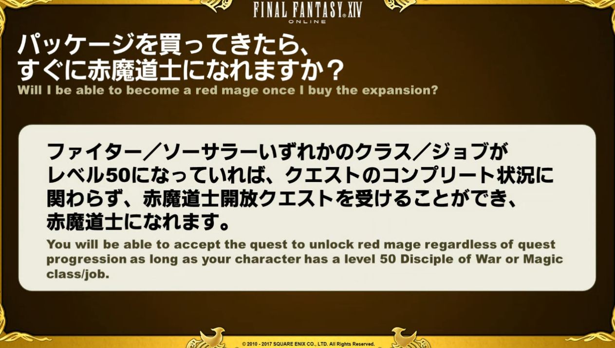 C’est très simple. Pour accéder au contenu de Stormblood durant l’accès anticipé, les joueurs devront terminer un certain nombre de quêtes d’Heavensward. Cependant, dès lors que vous avez un disciple de la guerre ou de la magie niveau 50, vous aurez la possibilité d’apprendre le nouveau job, mage rouge, qu’importe votre progression au niveau des quêtes, puisque la quête de job sera dans une zone de la version 2.0 (A Realm Reborn).