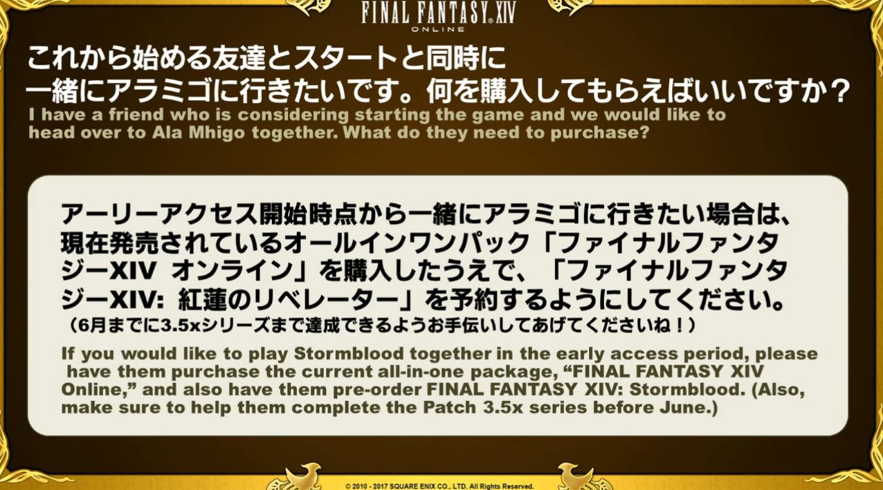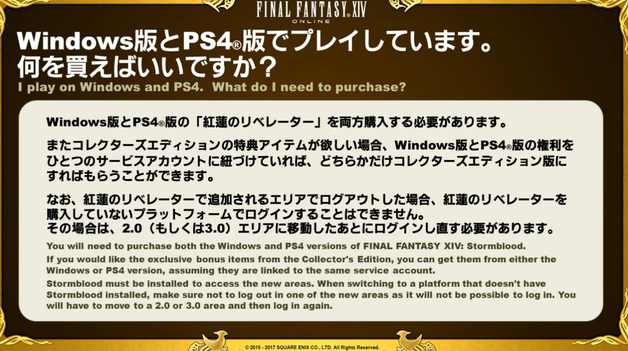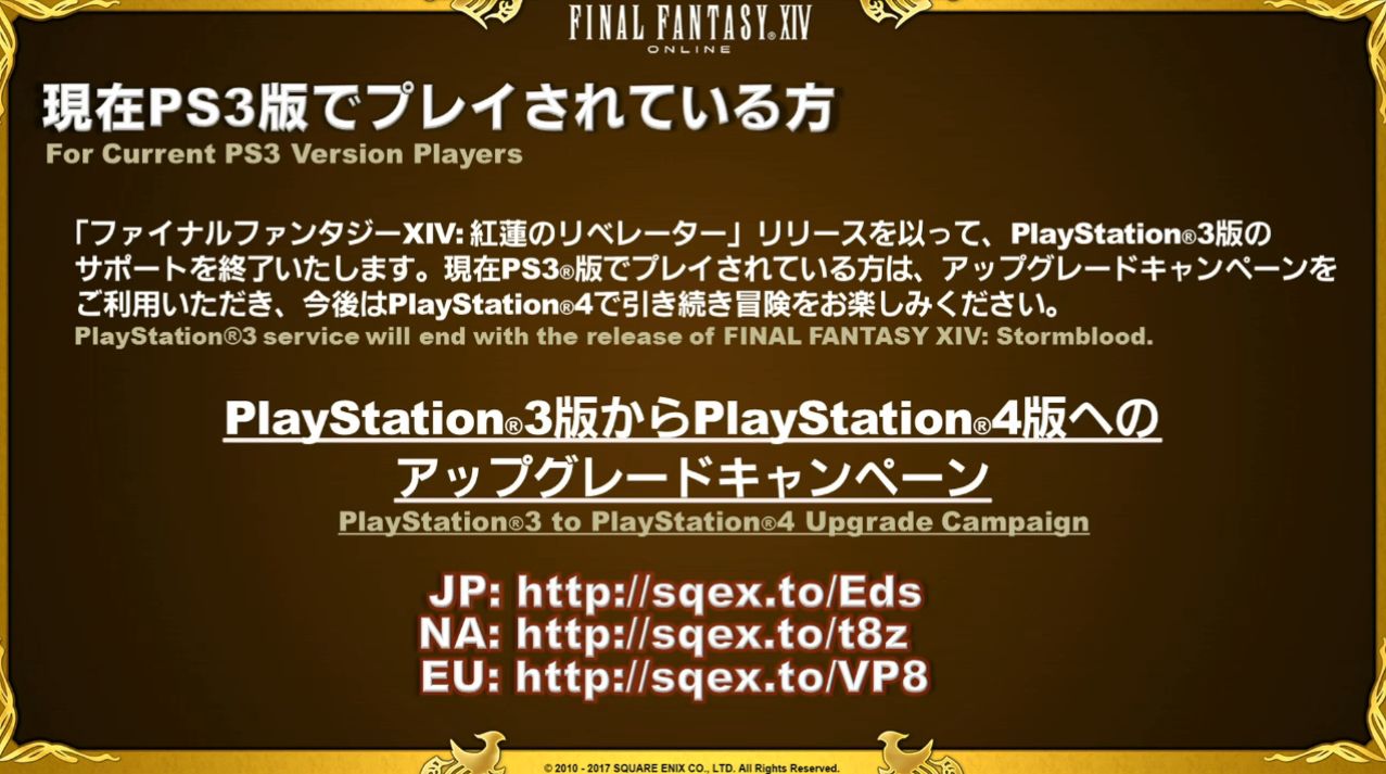 Pour les joueurs de Final Fantasy XIV sur PlayStation 3, le service fermera lorsque Stormblood sortira. Aussi, pour avoir plus de renseignements sur la campagne de mise à niveau de la PlayStation 4, rendez-vous sur cette page pour les joueurs Nord-Américains et cette page pour les joueurs Européens.