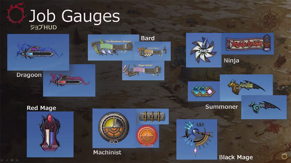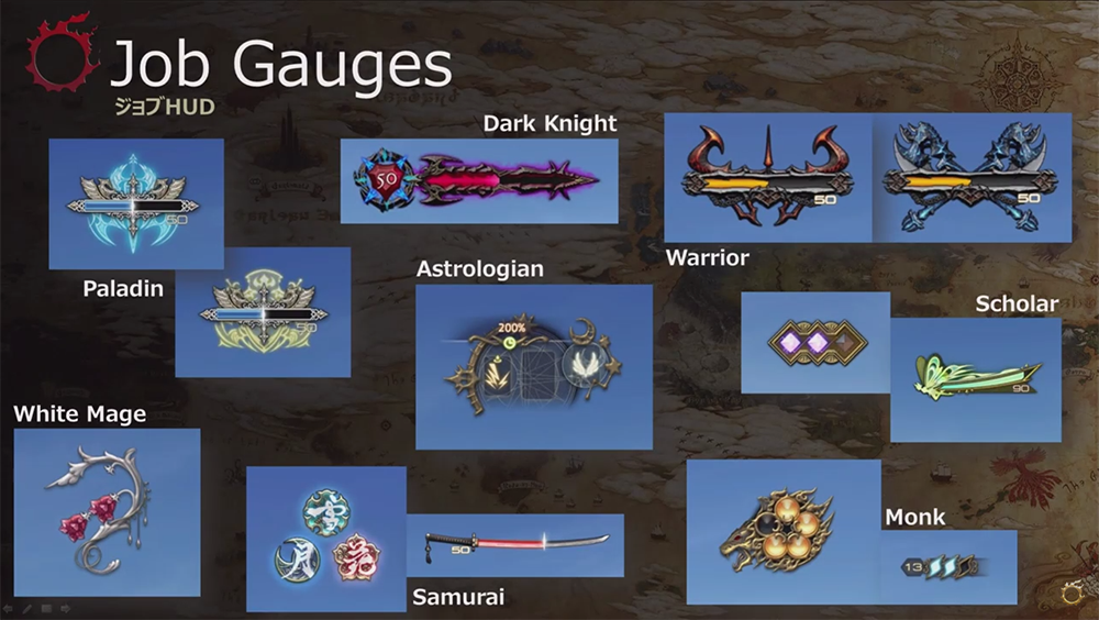 Ces jauges de job permettront aux joueurs de ne plus avoir à rester focalisées sur leurs barres d’altérations d’état. Spécialisées pour chaque job, elles serviront pour les actions spéciales, et permettront une bien meilleure visibilité sur le cycle. L’accent est donc mis sur le visuel pur, plutôt que les indices visuels, ce qui devrait permettre de réduire les disparités entre les DPS. Par exemple, la jauge du Paladin aura deux visuels, selon le serment selectionné. A noter également que, hors combat, les jauges sont à l’écran, mais de façon transparente. Elles ne gênent donc pas la visibilité globale.