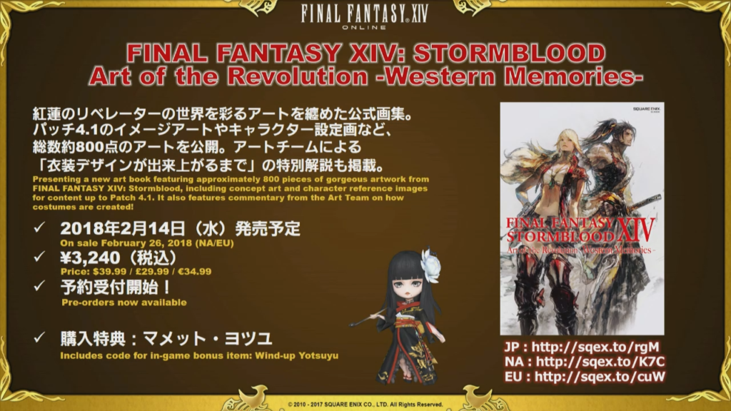 Artbook FFXIV – Stormblood The Art Of The Revolution, au prix de 34,99€ et disponible dés maintenant en précommande, sortie prévue le 26 Février 2018 au même titre que la magnifique statuette Meister Quality Figure Shiva au prix de 125,99€ Ces deux objets contiendront un code permettant l’obtention d’un objet bonus, respectivement la Mascotte Yotsuyu et une émote unique au même titre que le Zantetsuken d’Odin.