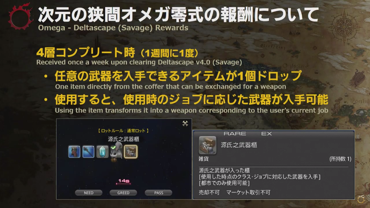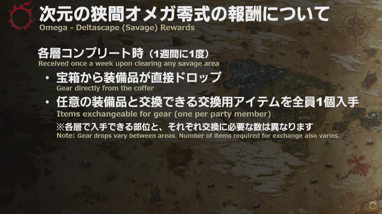 L’équipement s’obtiendra directement dans le coffre et certains objets seront échangeables contre de l’équipement (un par joueur). Les drops d’équipements pourront changer en fonction des étages. Le nombre d’items requis peut également varier. Un objet du coffre pourra être échangé contre une arme. Utiliser cet objet permet de transformer une arme droppée contre l’arme de la classe actuelle du joueur. Cela fonctionnera comme les récompenses des quêtes niveau 70, sauf que cela ne permettra de prendre uniquement l’arme de la classe avec laquelle vous avez fait Omega.