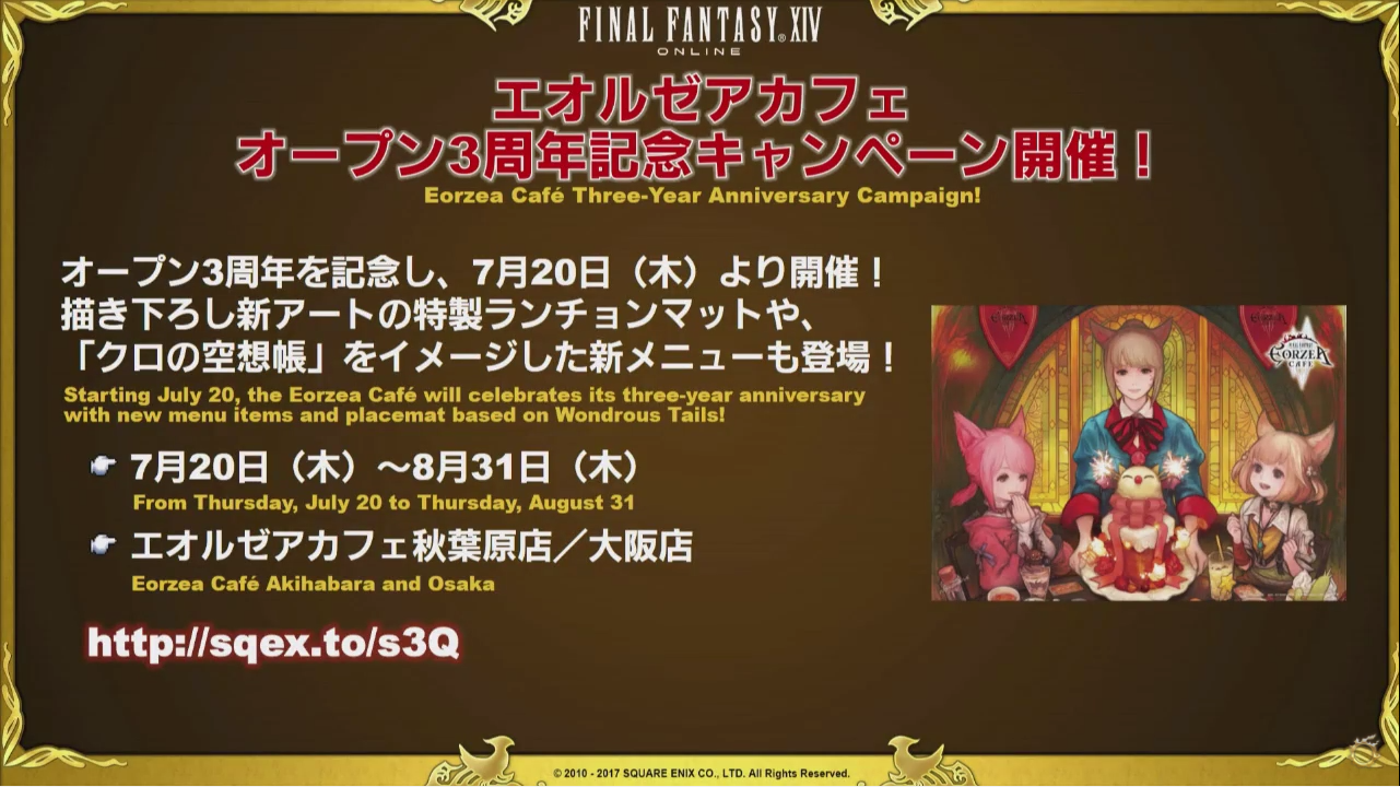 - Une campagne sera organisée à l’Eorzéa Café pour ses trois ans à partir du 20 juillet jusqu’au 31 août