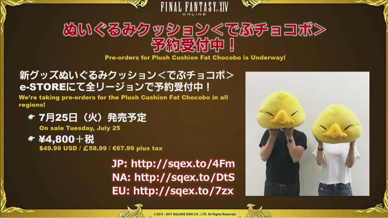 - Les pré-commandes pour la peluche-coussin Gros Chocobo sont disponibles dans toutes les régions (pour la France, c’est ICI)
