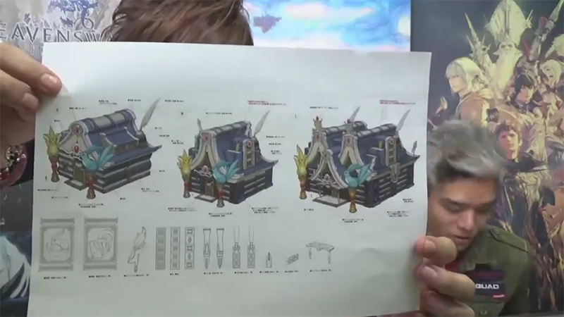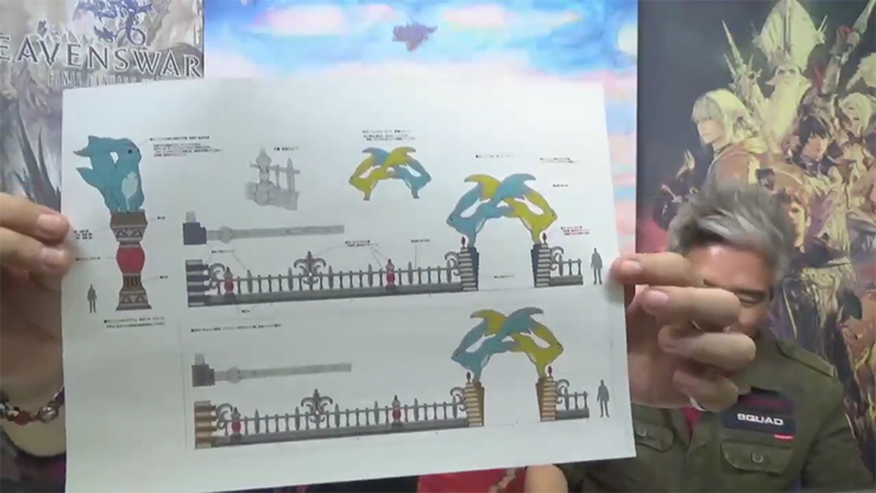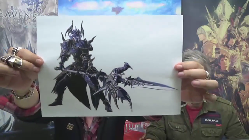 R11 : (Naoki Yoshida montre quelques images des nouvelles armures artefact. Foxclon, en bon chevalier servant, le débarrasse de sa tête de Chocobo encombrante.)