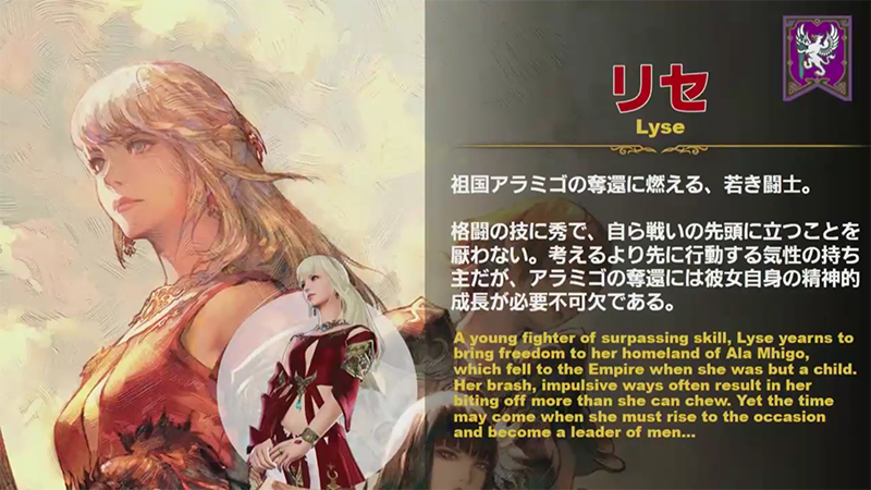 Tout d’abord, Lyse : « Jeune combattante qui brûle d’envie de libérer sa patrie natale d’Ala Mhigo du joug garlemaldais, Lyse aime se lancer tête baissée dans la bagarre. Son caractère impulsif fait qu’elle agit souvent sans réfléchir, mais face aux défis qui se présentent à elle, il lui faudra gagner en maturité pour arriver à ses fins. »