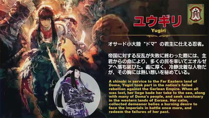 Yugiri : « Suite à l’échec d’un soulèvement de rebelles domiens contre l’occupant garlemaldais, cette femme ninja s’est vu confier par son seigneur déchu l’importante responsabilité de conduire la fuite de nombreux rescapés vers Éorzéa. Bien qu’elle suive un code d’honneur strict et se montre imperturbable en toute occasion, il brûle au plus profond d’elle une puissante passion. »