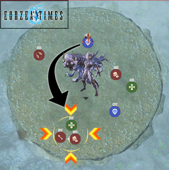 Ensuite, sans cast, des flèches dans une Aoe assez large apparaitront, montrant à la fois la taille de l’Aoe ainsi que l’itinéraire que l’attaque va parcourir en ligne droite.