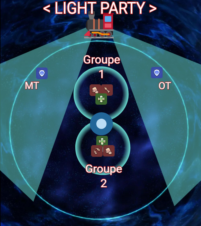 Car UN HEAL et UN TANK recevront un débuff qui va faire office de répercussion de ce faisceau: à son explosion, il dupliquera son AOE en AOE de partage sur ces 2 joueurs ! Vous comprenez désormais l’intêret de faire 2 groupes de 4 joueurs !