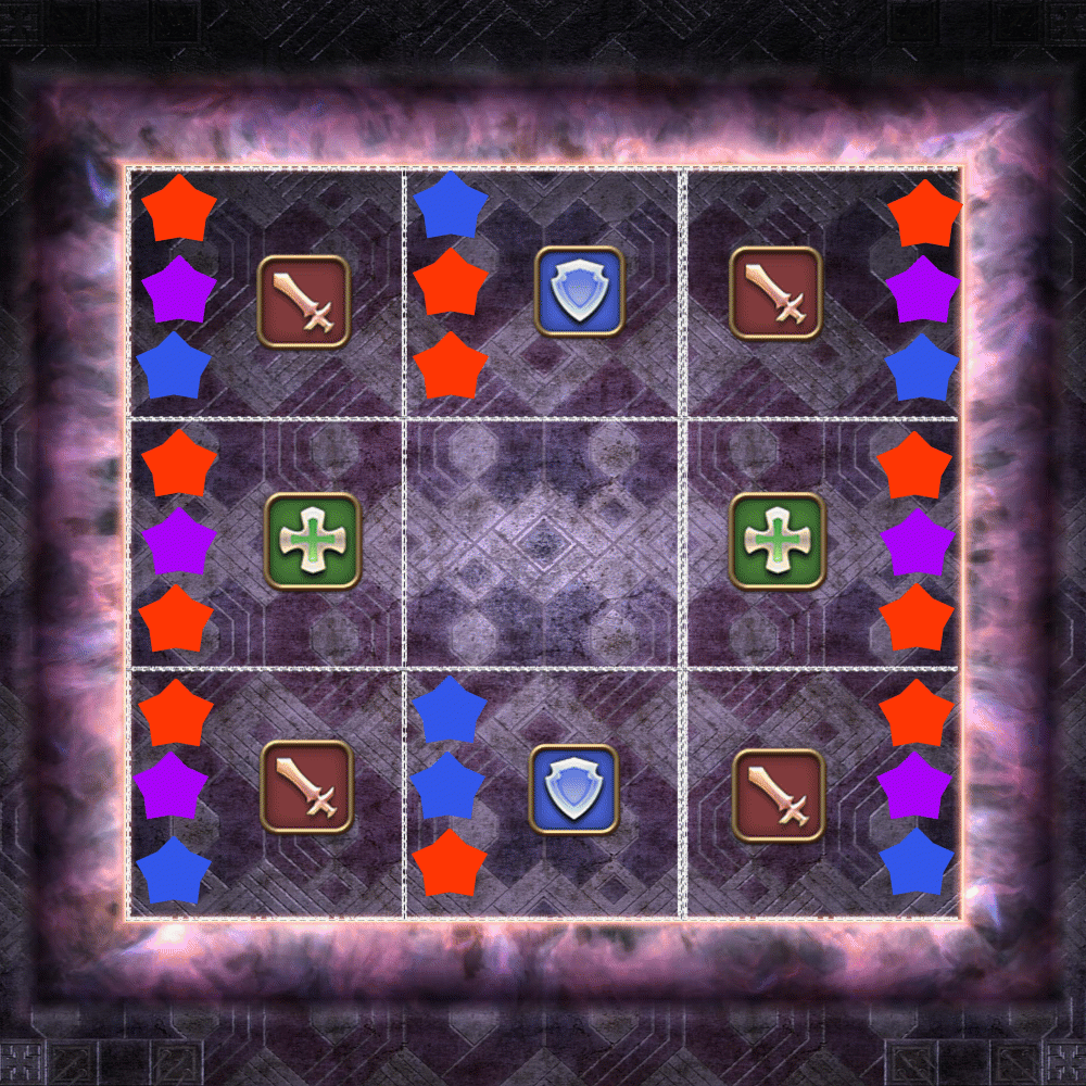 > Vous aurez 9 cases (3×3), chacune des cases ayant un cristal devront obligatoirement être prises par au moins un joueur (la case centrale ne compte pas)